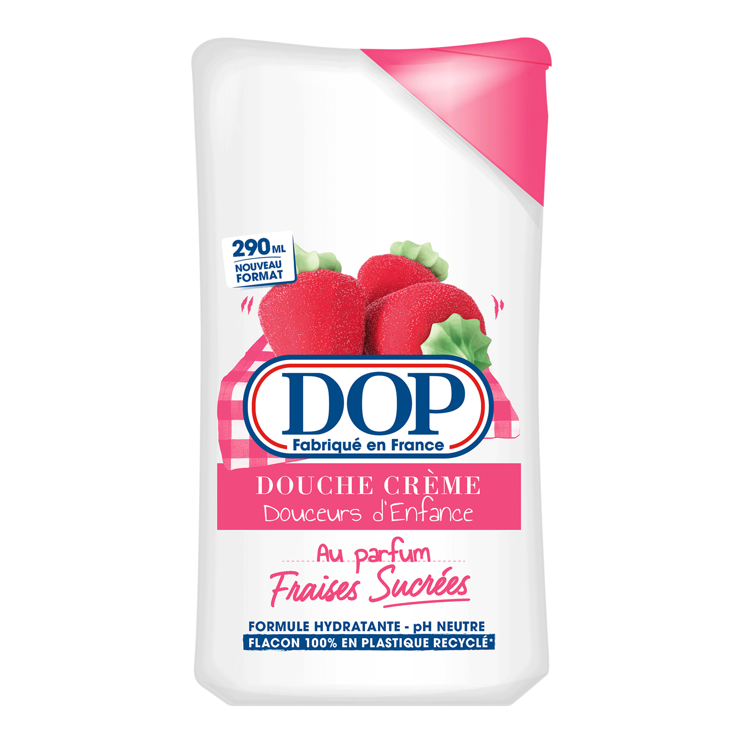 Pour la 1ere fois les laboratoires de DOP ont recrée dans une douche crème le parfum unique des fraises sucrées qui régalent les grands et les petits.